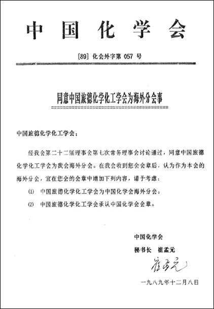 中国旅德学者化学化工学会于1989年12月以德国分会的身份加入中国化学会。
