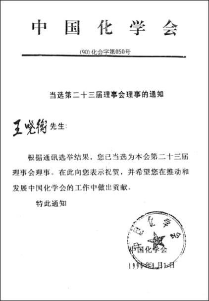 中国旅德学者化学化工学会首任理事长王晓衡博士于1990年9月当选为中国化学会理事。
